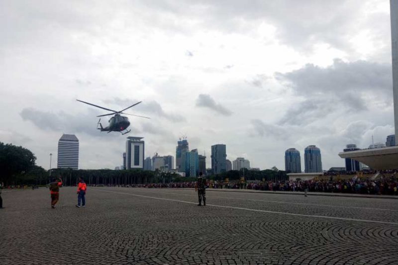 Berdasarkan pantauan ANTARA pada pukul 15.00 WIB saat satu unit helikopter milik TNI turun di halaman Monas, masyarakat langsung berbondong- bondong memenuhi teras tugu Monas arah Selatan.