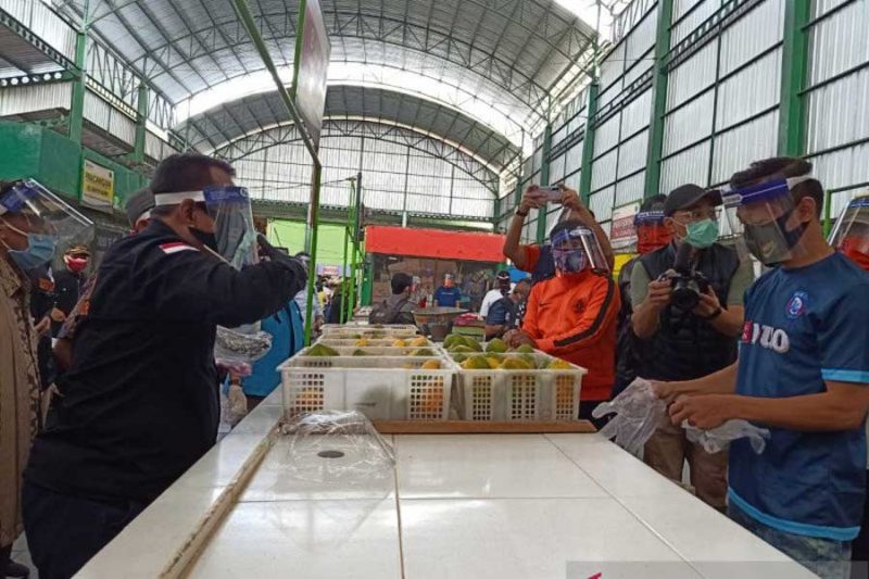 Selain meninjau keberadaan pasar, Sekda Jatim itu juga membagikan Alat Pelindung Diri (APD) berupa masker, sarung tangan, dan face shield kepada penjual dan pengunjung di pasar tersebut.