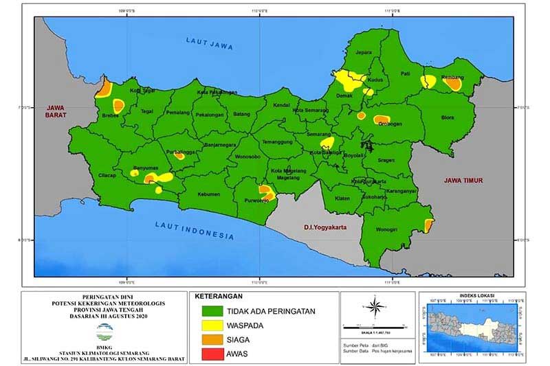 Ia mengatakan status tersebut diketahui berdasarkan peringatan dini potensi kekeringan meteorologis untuk dasarian (10 hari) ketiga bulan Agustus 2020 yang dikeluarkan BMKG Stasiun Klimatologi Semarang.