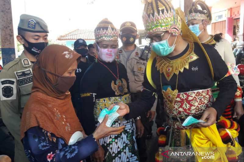 “Hari ini kami bersama seniman dan budayawan turun ke pasar dan pusat-pusat keramaian di Kabupaten Temanggung dengan memakai baju karakter wayang dan baju kesenian tradisional kuda lumping, warokan, dan topeng ireng untuk melakukan sosialisasi kepada masyarakat tentang wajib menggunakan masker di era adaptasi kebiasaan baru ini,” kata Khadziq.