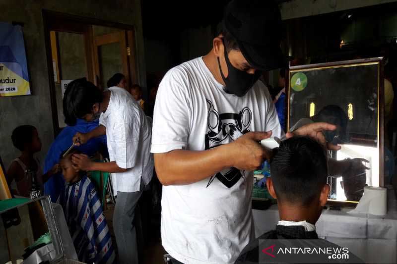 Sebanyak empat orang kakak beradik yang semuanya berprofesi sebagai tukang cukur mengadakan bakti sosial potong rambut gratis kepada para pengungsi dan relawan di pengungsian Desa Deyangan Kecamatan Mertoyudan Kabupaten Magelang, Minggu (15/11/2020).