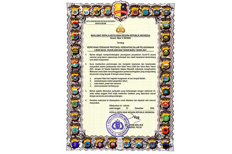 Sehubungan itu, Kapolri mengeluarkan Maklumat untuk tidak menyelenggarakan pertemuan/kegiatan yang mengundang kerumunan orang banyak di tempat umum berupa perayaan Natal dan kegiatan keagamaan di luar tempat ibadah, pesta/perayaan malam pergantian tahun, arak-arakan, pawai dan karnaval, serta pesta penyalaan kembang api.