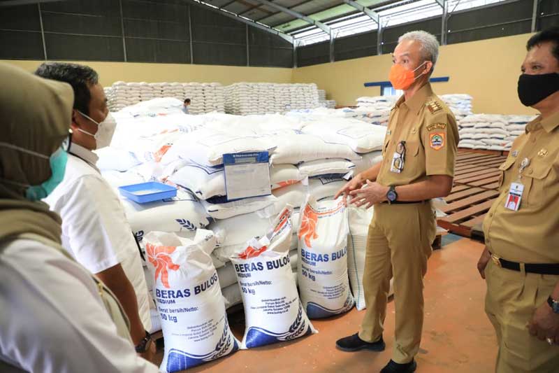 Didampingi Wakil Bupati Klaten, Yoga Hardaya dan Pemimpin Wilayah Bulog Jateng, Miftahul Ulum, Ganjar melihat stok beras yang ada di gudang itu. Ribuan sak beras tertata dengan rapi di gudang itu.