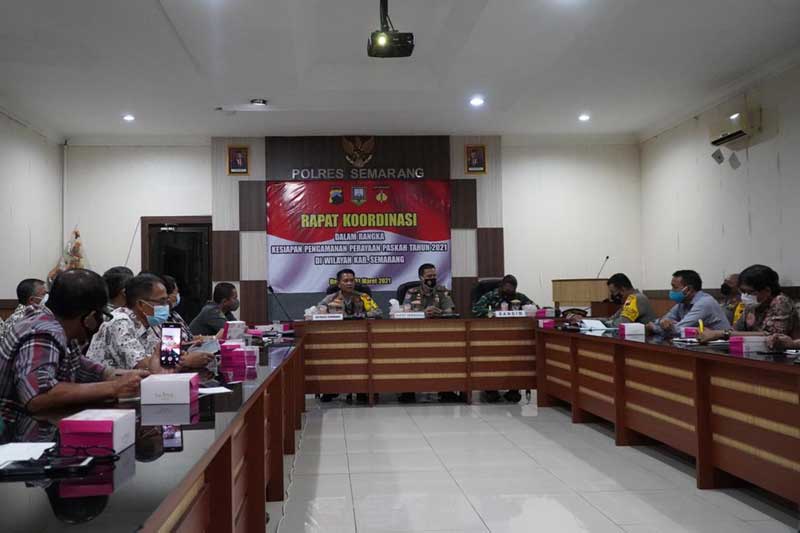 UNGARAN, Cakram.net – Polres Semarang menggelar rapat koordinasi lintas sektoral dalam rangka mengantisipasi gangguan keamanan dan ketertiban masyarakat (Kamtibmas) serta pencegahan penyebaran Covid-19 saat perayaan Paskah di wilayah Kabupaten Semarang, Rabu (31/3/2021).