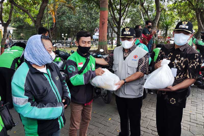 UNGARAN, Cakram.net – Bupati Semarang, Ngesti Nugraha bersama Wakil Bupati (Wabup) Semarang, M Basari membagikan bantuan paket sembako kepada sejumlah driver ojek online (ojol) yang tengah mangkal di seputaran depan Rumah Dinas (Rumdin) Bupati Semarang Jalan Ahmad Yani Ungaran, Sabtu 31 Juli 2021.