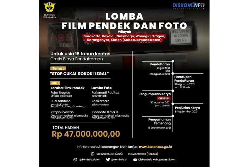KLATEN, Cakram.net – Dinas Komunikasi dan Informatika (Diskominfo) Kabupaten Klaten bekerja sama dengan Kantor Bea dan Cukai Surakarta menggelar lomba film pendek untuk masyarakat di wilayah ekskaresidenan Surakarta. Lomba bertema “Stop Cukai Rokok Ilegal” dengan hadiah total senilai Rp47 juta ini digelar sebagai upaya memerangi peredaran cukai rokok ilegal.