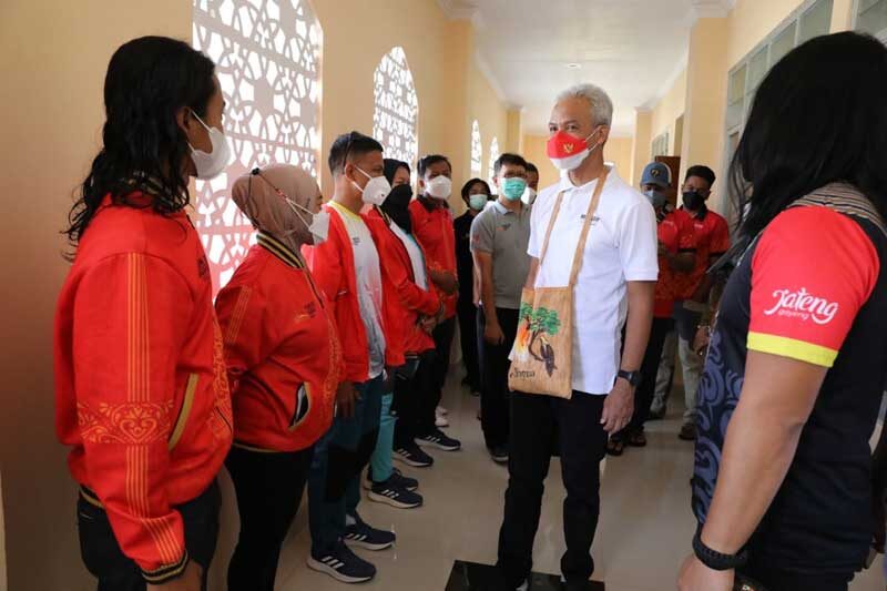 “Gimana kabarnya? Makanan di sini enak tidak? Kalau tidak enak, langsung bilang ke pengelola hotel ya, biar diganti,” sapa Ganjar pada atlet Jabar.