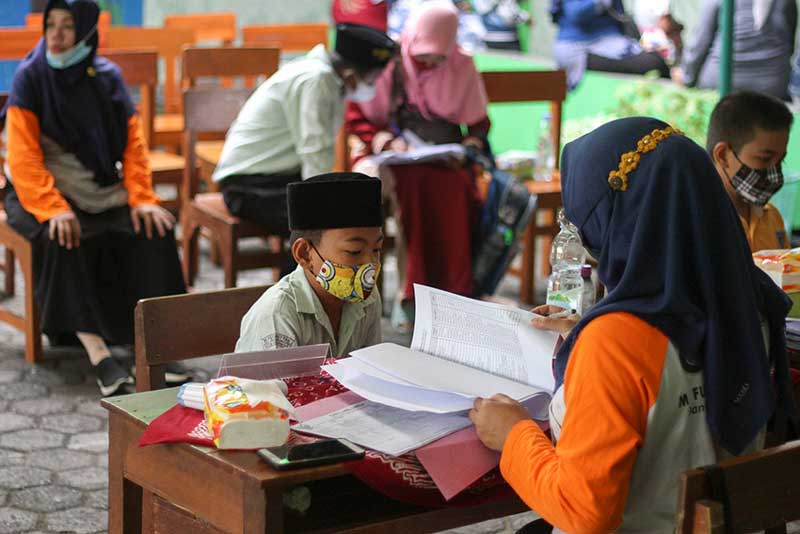 Siswa melakukan proses pendataan sebelum di suntik vaksin COVID-19 dosis pertama di halaman Sekolah MI Futuhiyah, Palebon, Kota Semarang, Jawa Tengah, Rabu 5 Januari 2022. Dinas Kesehatan Kota Semarang menargetkan vaksinasi kepada sebanyak 165.185 anak usia 6-11 tahun di satuan pendidikan atau sekolahan secara bertahap dari siswa sekolah negeri,madrasah maupun swasta sebagai upaya mendukung program pemerintah menuju kekebalan komunal ( Herd Immunity). Foto: Cakram.net/Ahmad Samsudin