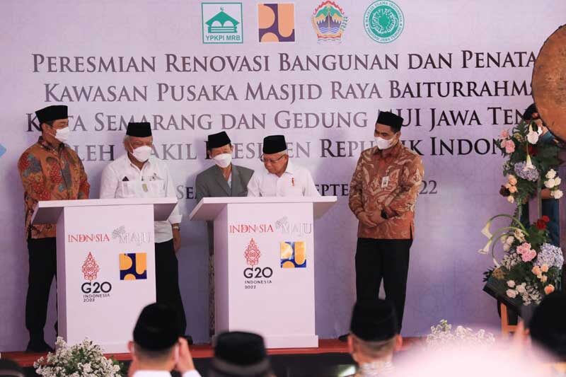 SEMARANG, Cakram.net – Renovasi dan penataan Masjid Baiturrahman Semarang selesai tepat waktu. Penyelesaian pembangunannya diresmikan oleh Wakil Presiden RI KH Ma’ruf Amin didampingi Wakil Gubernur Jawa Tengah Taj Yasin Maimoen, Jumat 23 September 2022.