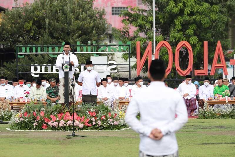 “Kita melihat bahwa santri yang ada di belakang saya, identik dengan masjidnya yang kokoh itu, selalu berdampingan dengan alun-alun, yang mana alun-alun ini sarana untuk mempererat kemanusian, kemasyarakatan,” tutur Wagub Taj Yasin saat menjadi Inspektur Upacara Hari Santri.