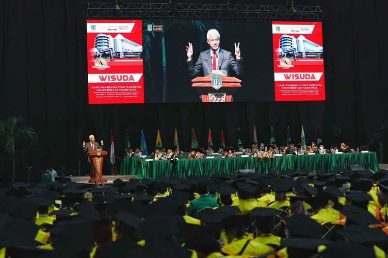 JAKARTA, Cakram.net – Gubernur Jawa Tengah Ganjar Pranowo menjadi tamu kehormatan untuk memberi pembekalan pada wisuda pascasarjana dan sarjana Universitas Nasional (Unas) Jakarta di Jakarta Conventional Centre, Kamis 17 November 2022. Ia berpesan agar para wisudawan dapat menerapkan ilmunya secara kolaborasi dalam menghadapi tantangan dunia baru.