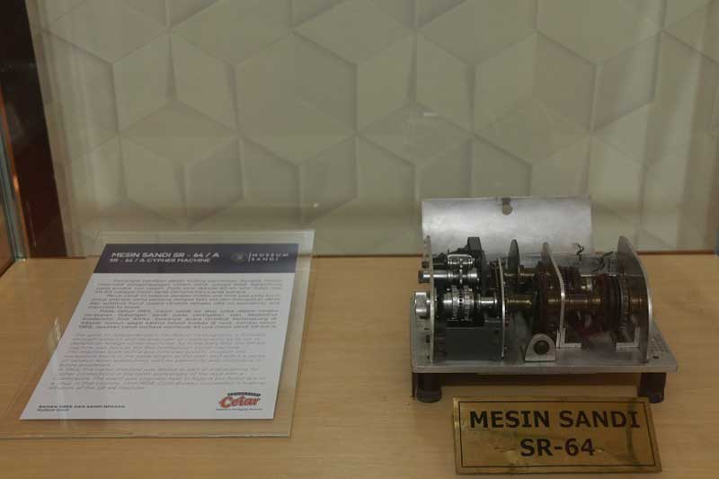 “Selanjutnya ini koleksi museum sandi yang cukup langka, salah satu mesin sandi koleksi asli produksi dalam negeri yaitu SR (Sandi Roebiono Kertopati) 64 menggunakan metode semi elektronik dengan menggunakan pin hil, dan ini masih uji coba di buat sebanyak 64 buah dan tinggal satu mesin sandi ini asli dibuat produksi Indonesia,” ujarnya.