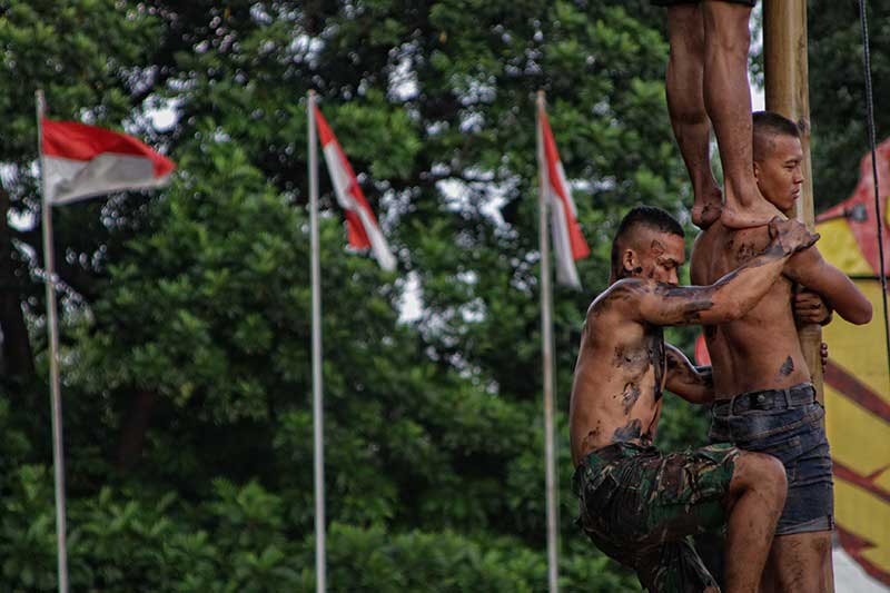 Peserta dari Prajurit TNI Yonif Raider 400/Banteng Raiders bekerja sama memanjat tiang saat lomba panjat pinang di Mako Yonif Raider 400/BR, Kota Semarang, Jawa Tengah, Sabtu 12 Agustus 2023. Berbagai perlombaan yang digelar dengan melibatkan masyarakat, wartawan, dan prajurit TNI itu dalam rangka memeriahkan HUT ke-78 Kemerdekaan Republik Indonesia. Foto: Cakram.net/Ahmad Samsudin