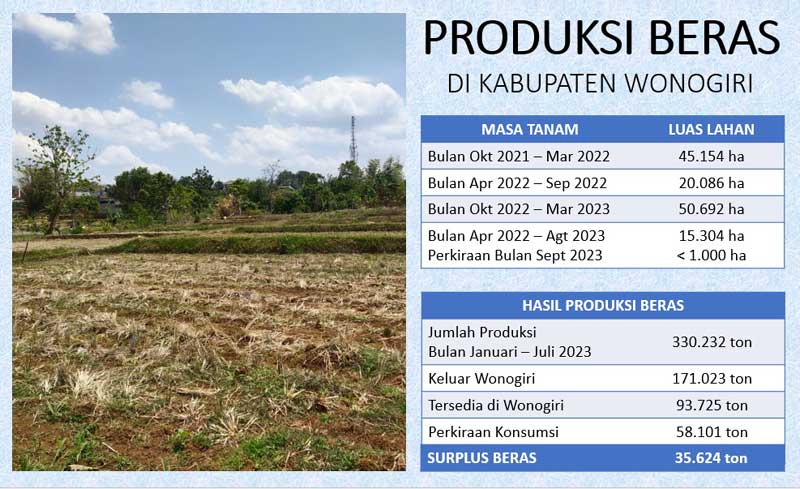 Niken mengungkapkan data produksi gabah kering giling (GKG) sampai Juli 2023 di Wonogiri sebanyak 330.232 ton. Dari angka itu, dia memperkirakan GKG yang keluar dari Wonogiri sebanyak 171.023 ton. Dengan begitu ketersediaan GKG di Wonogiri sampai Juli 2023 sebanyak 93.725 ton atau setara 93.725 ton.
