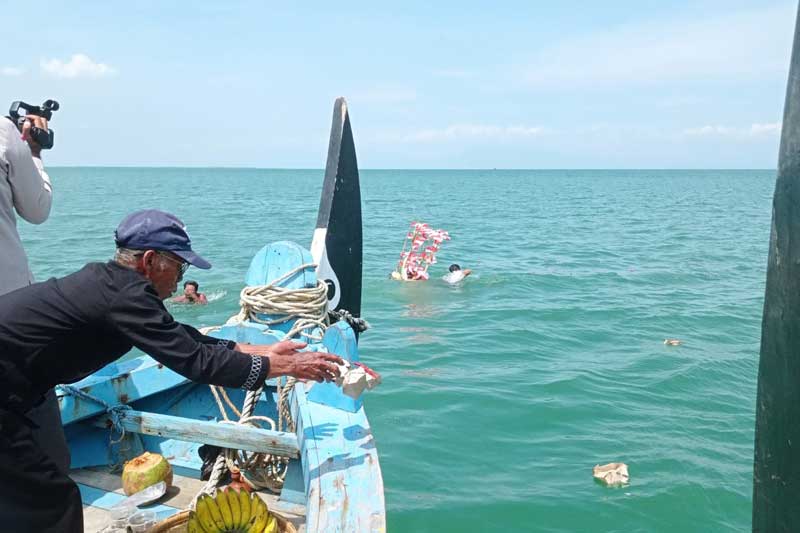 Panitia sedekah laut dan syawalan Desa Bungo, Sutriman mengatakan, pada prosesi sedekah laut warga melarung satu ekor kepala kambing kendit.