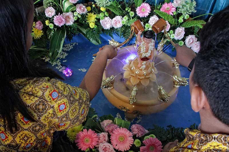 Umat Buddha membersihkan patung Buddha usai mengikuti kebaktikan ritual upacara pemandian Buddha Rupang di Vihara Mahavira Graha, Semarang, Jawa Tengah, Rabu 15 Mei 2024. Ritual pemandian dan pembersihan Buddha Rupang yang dilakukan oleh pemuka agama serta para jemaah kebaktian umat tersebut sebagai lambang membersihkan segala kekotoran batin dalam diri baik ucapan, pikiran maupun perbuatan untuk menyambut Hari Raya Waisak 2568 BE. Foto: cakram.net/Ahmad Samsudin