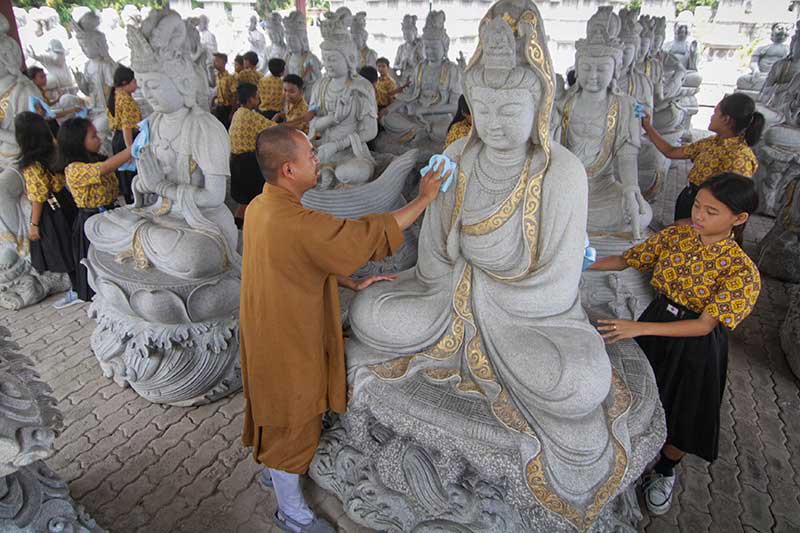 Siswa SD Kuncup Melati ikut membersihkan patung Dewi Kwan Im usai mengikuti kebaktikan ritual upacara pemandian Buddha Rupang di Vihara Mahavira Graha, Semarang, Jawa Tengah, Rabu 15 Mei 2024. Ritual pemandian dan pembersihan Buddha Rupang yang dilakukan oleh pemuka agama serta para jemaah kebaktian umat tersebut sebagai lambang membersihkan segala kekotoran batin dalam diri baik ucapan, pikiran maupun perbuatan untuk menyambut Hari Raya Waisak 2568 BE. Foto: cakram.net/Ahmad Samsudin